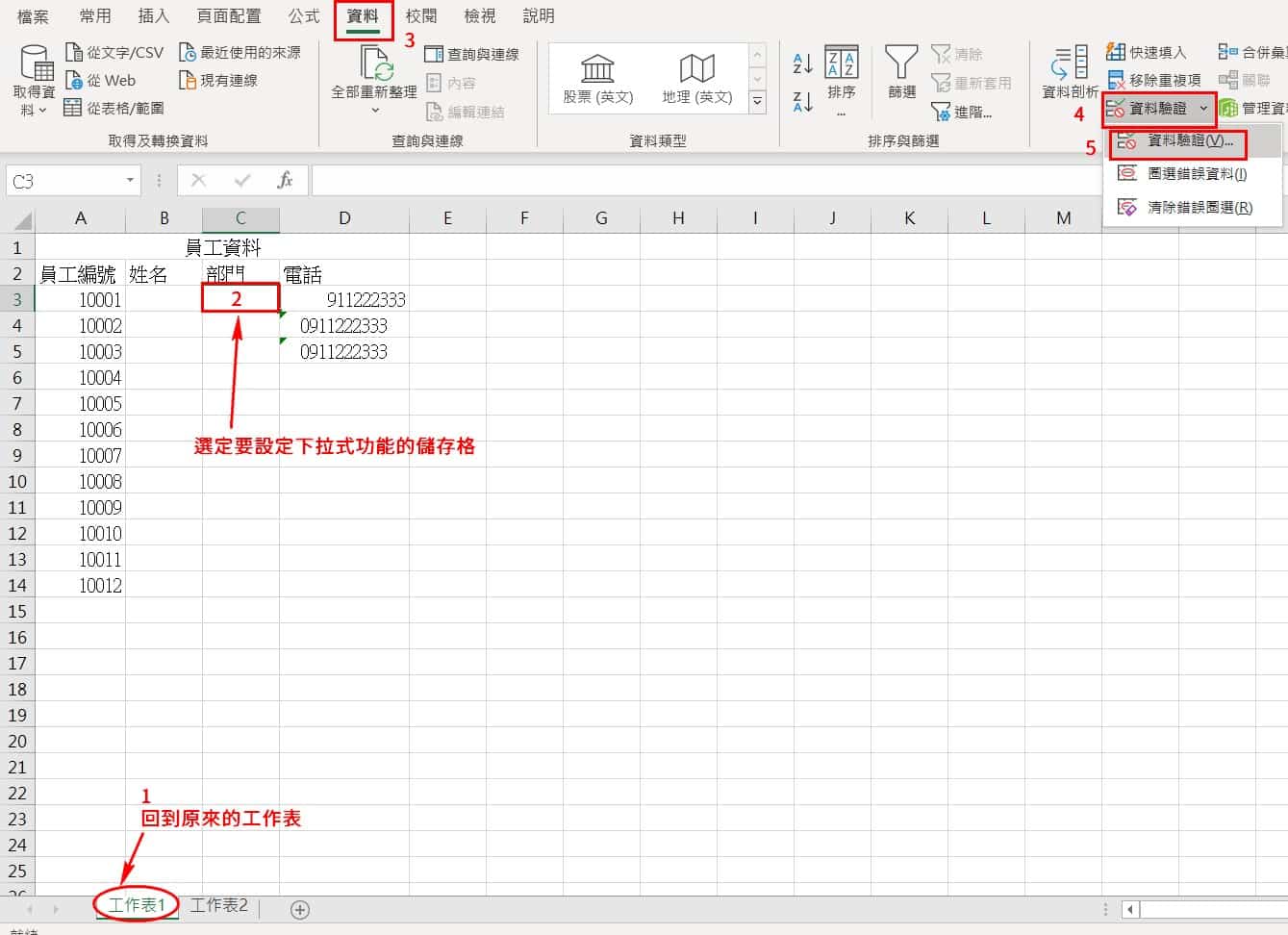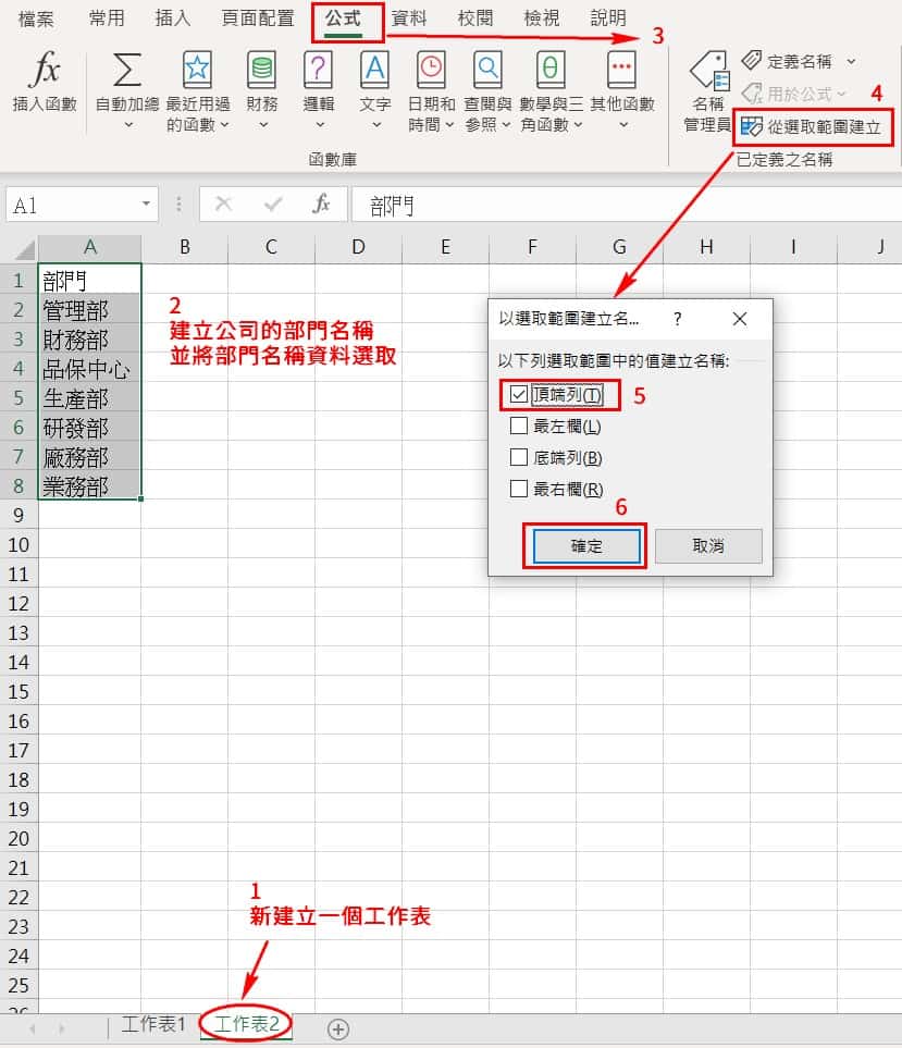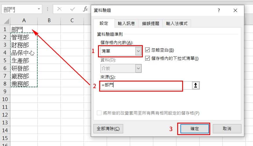 来源会是刚刚建立的名称定义(资料标题):部门,在点选清单后,将光标点选到来源的内容,此时点选工作表2,接下来可用选取全部的部门名称或键入”部门“两字。完成后点选确认。