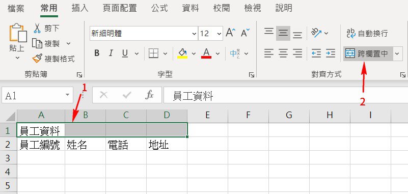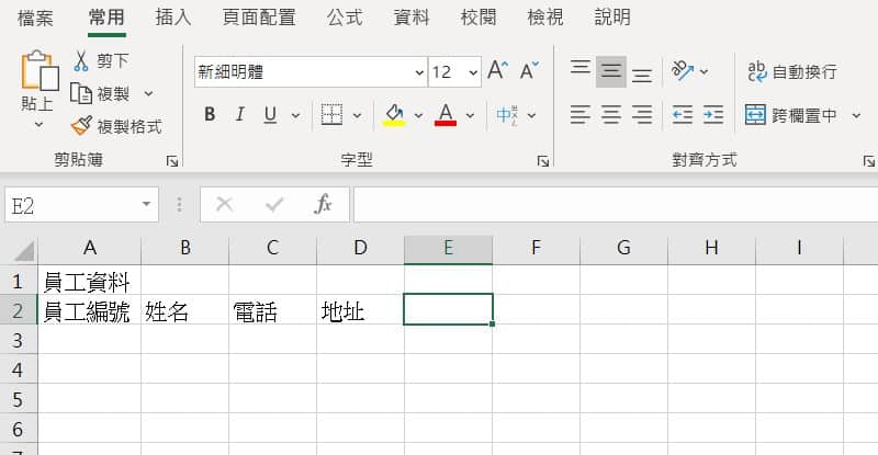 将下列员工数据字段的标题先键入,最上方员工资料希望在资料表的中间,需要合并栏位置中。