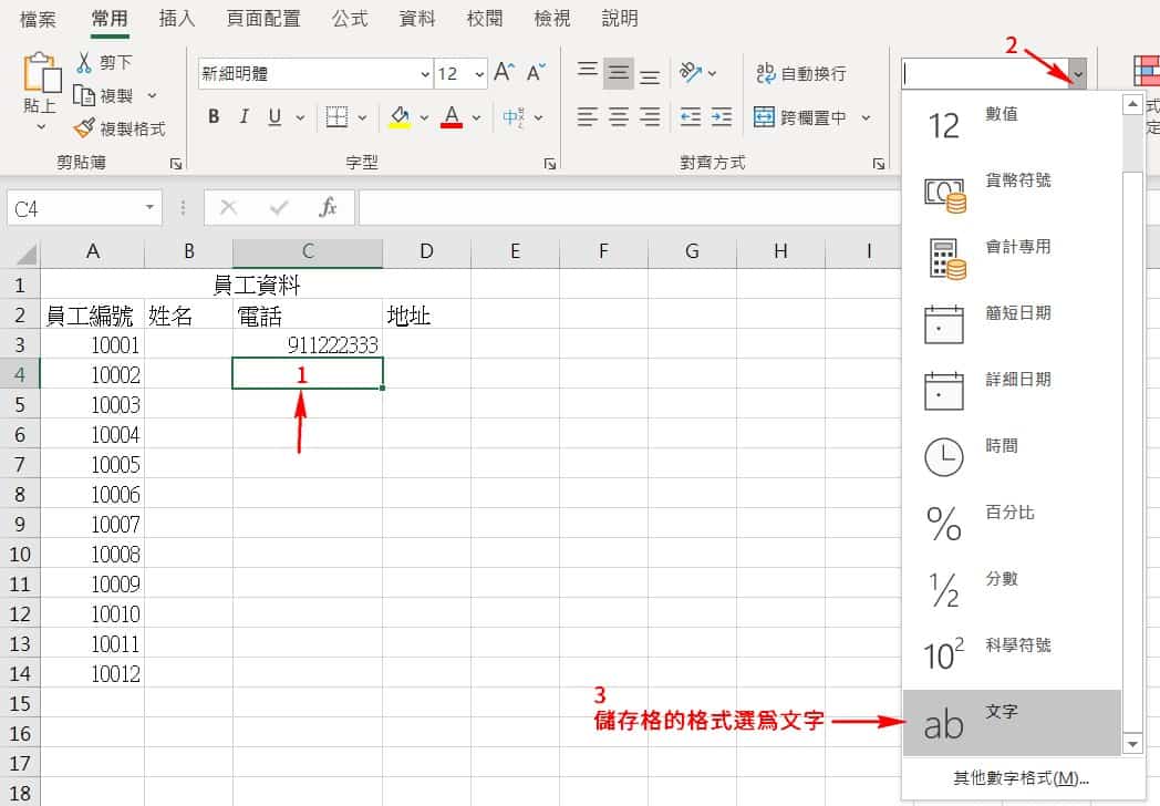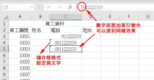 或是在数字前面加入单引号 ’ 也有同样效果