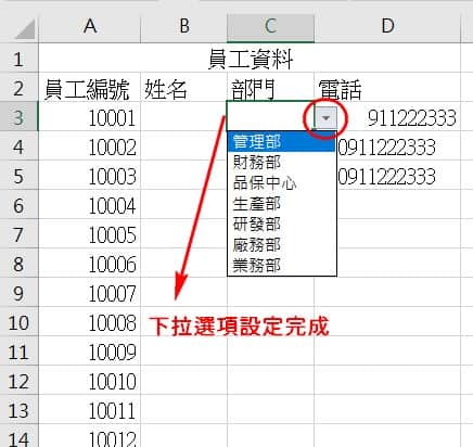 设定完成后回到工作表1,这个单元格点选时候出现往下的箭头,点选即可看到设定的部门清单