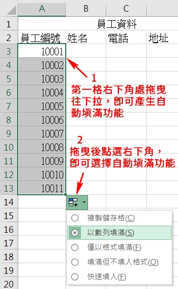 此时从+处直接往下拖曳储存格就会产生自动填满功能,拖曳完成后再选取下图2的图标选项,选择以数列填满,就可以看到刚刚拖曳的储存格现在是按照顺序的数字了。拖曳自动填满功能时,excel会预先使用系统带入的功能,如果不是自己的需求,点选下图2的功能列表即可自己选取。