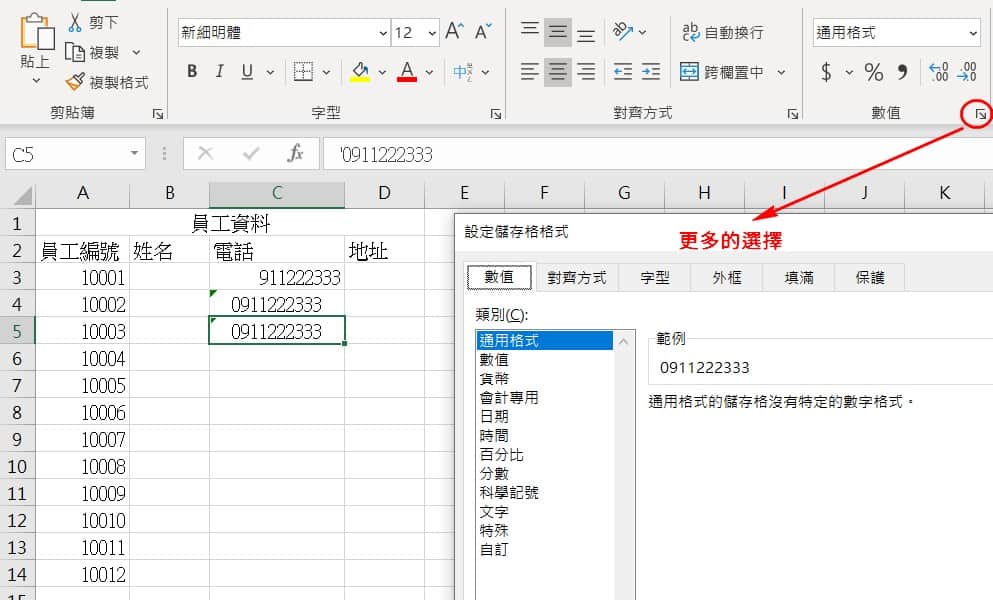 如下图,原本键入的手机号码有0开头,但输入完后就不见了,此时更改储存格的格式设定即可。