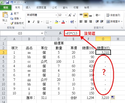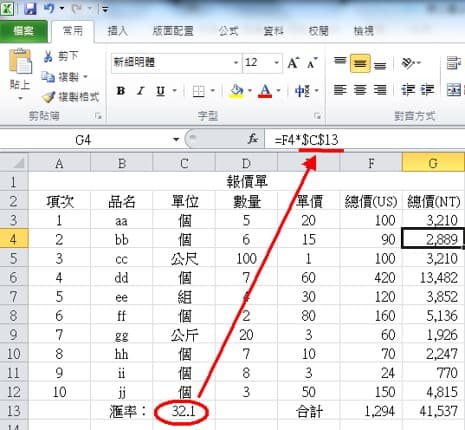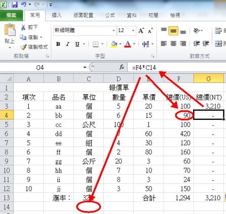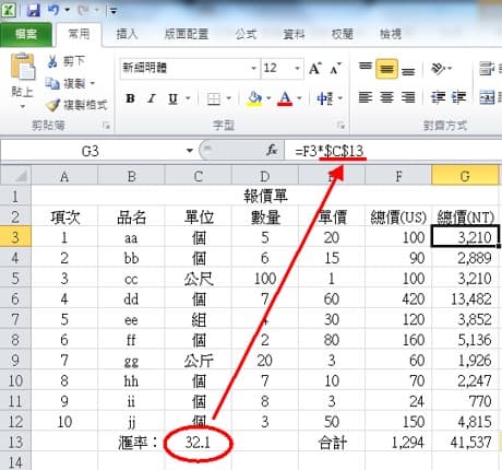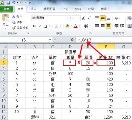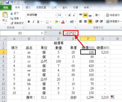 我们用下图的台币总价(NT)这一栏来当例子,总价(NT)的第一格G3,会等于美金总价(US)乘以汇率,函数写法就是G3=F3*C13