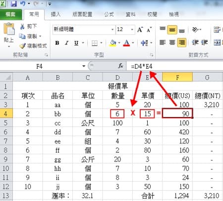 自动填满的复制公式,如下图,拖曳后可见每个总价(US)是呼应到往下应该的数量及单价,如F4=D4*E4